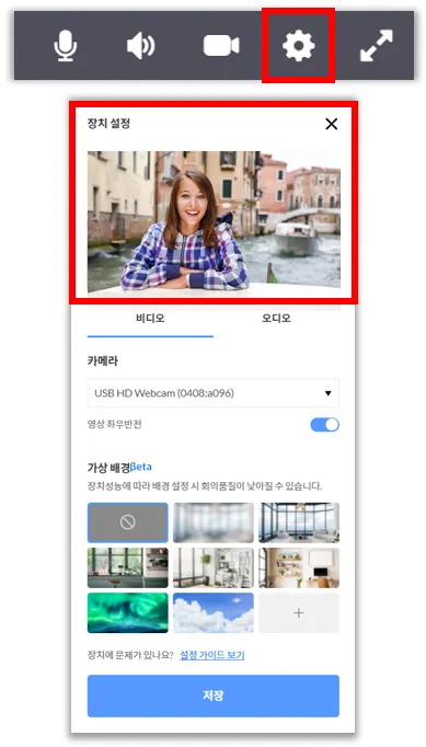 입장한 미팅룸 상단 톱니바퀴 버튼을 눌러 카메라 영상이 나오는지 확인해 주세요.
