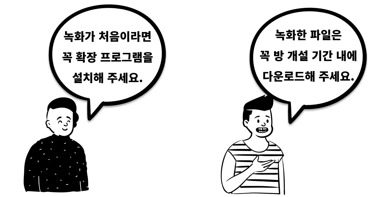 녹화를 진행해 주신 분의 채팅창에만 녹화 파일이 올라오며 진행해 주신 분만 다운받을 수 있습니다.