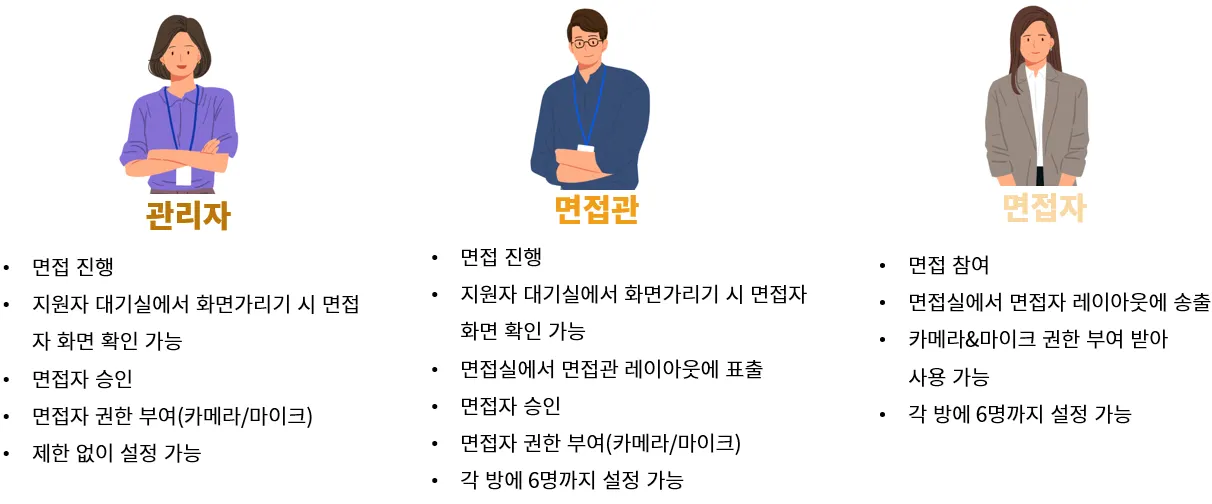 반대로 기능 권한이 없는 사람(ex. 면접자, 학생)은 카메라를 켜거나 말을 하기 위해서는 상위 역할 권한을 가진 사람에게 역할 권한 혹은 기능 권한 부여 요청을 해야 합니다.