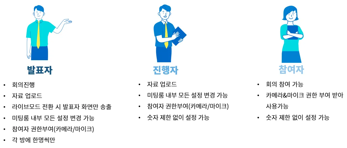 역할 권한을 부여받으면 화면을 넘기거나 특정 사람 혹은 전체 참여자를 강제퇴장을 시키는 등 미팅룸 내 모든 기능 권한을 사용할 수 있습니다.