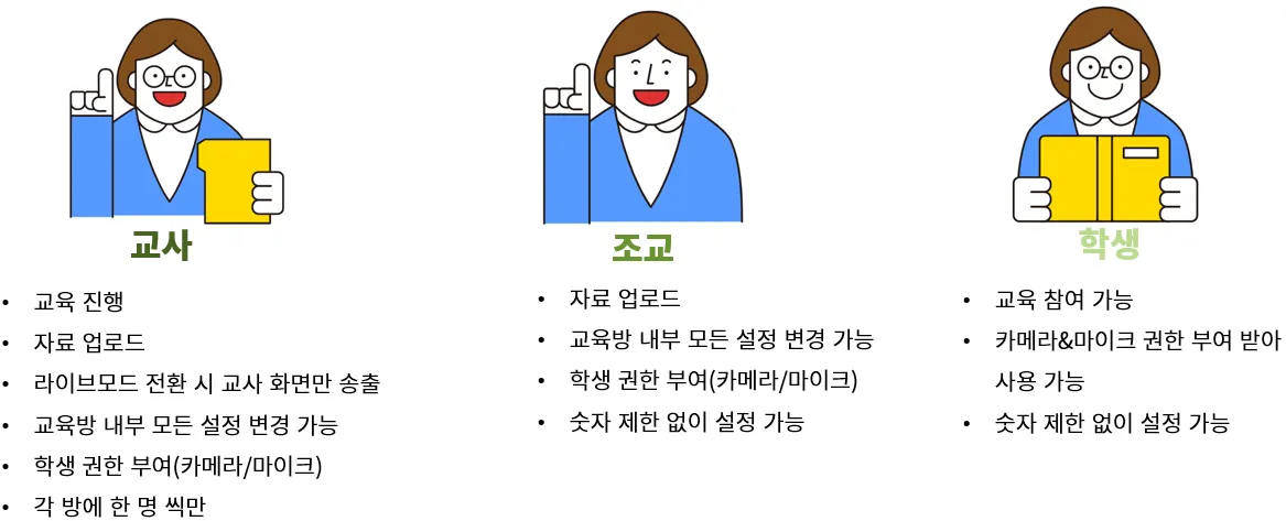 상위 역할 권한(ex. 발표자, 교사)이 있는 사람은 다른 사람에게 역할 권한(ex. 진행자, 조교) 또는 기능 권한(ex. 카메라 켜기, 마이크 켜기)을 부여하거나 뺏을 수 있습니다.