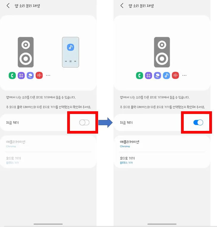 앱 소리 분리 재생 탭으로 들어간 후, 지금 켜기를 활성화합니다.
