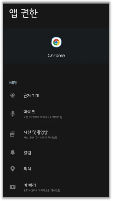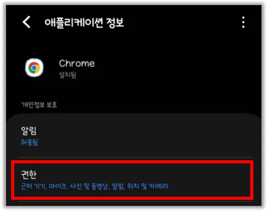 휴대폰 설정 - 애플리케이션 - 크롬어플 (chrome) - 권한 으로 입장합니다.