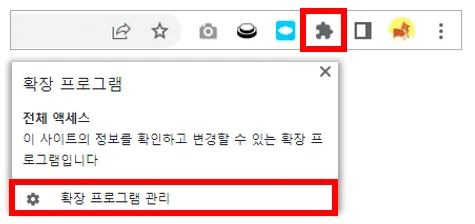 크롬 페이지 주소창 우측 끝에 위치한 퍼즐 모양 버튼을 눌러 확장 프로그램 관리로 이동해 주세요.