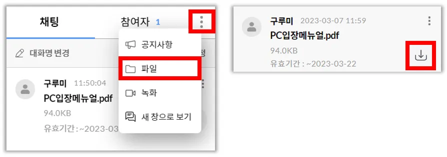 화면 오른쪽에 위치한 채팅창에 있는 오른쪽 점 세 개를 누른 후, 파일 버튼 클릭 > 다운로드 버튼을 클릭하면 교육 자료를 다운로드할 수 있습니다.