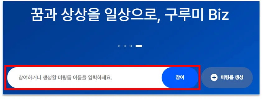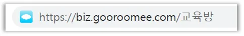 https://biz.gooroomee.com/ 홈페이지 첫 화면에 있는 방 이름 입력 칸에 알고 계신 방의 이름을 “띄어쓰기를 포함하여 정확하게 입력”하여 입장할 수 있습니다.