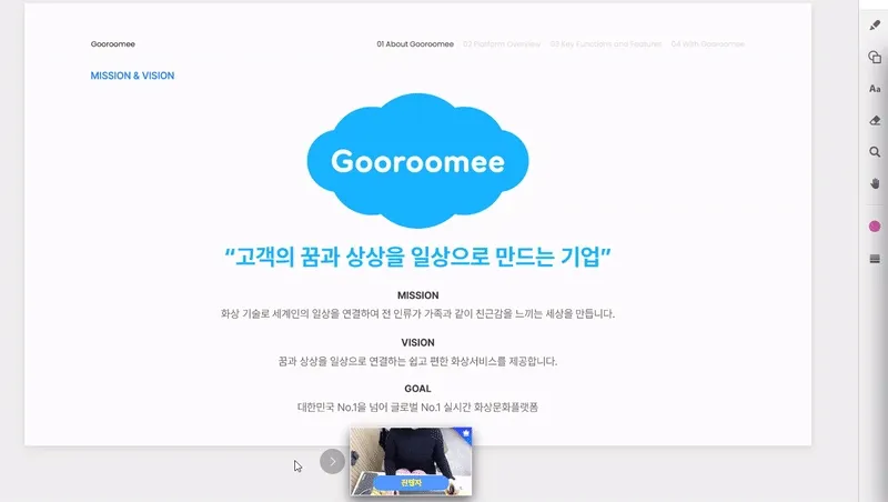 문서가 공유되고 있는 화면 아래 중앙에 위치한 진행자 카메라 화면의 왼쪽에 보면 동그란 화살표 표시가 있습니다. 이 화살표를 한번 누르면 오른쪽으로 이동하며, 한번 더 누르면 숨길 수 있습니다.