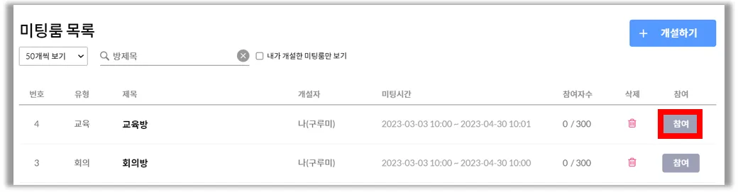 미팅룸 목록에서 입장해야 할 미팅룸 이름의 오른쪽에 있는 참여 버튼을 눌러 입장할 수 있습니다.