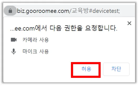 방에 들어가기 전에 나오는 장치 테스트 화면에서 왼쪽 위에 카메라/마이크 허용 팝업창이 뜹니다.
