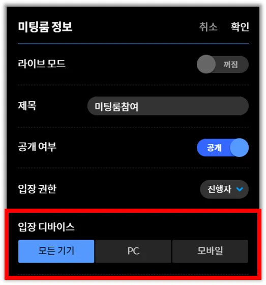 해당 미팅룸에 권한이 있는 유저(교사/조교/발표자/진행자)는 미팅룸에 모바일 기기로만 입장이 가능하게 설정할 수 있으며, 변경도 가능합니다.
