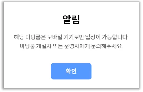 모바일 기기로만 입장할 수 있게 설정한 미팅룸에 PC로 입장을 시도할 때 보이는 알림 창입니다.