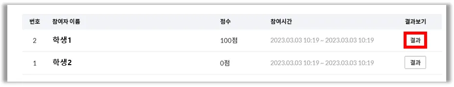 더 자세한 결과를 확인하고 싶으시다면, 해당 참여자의 이름 옆의 결과 버튼을 클릭해 주세요.