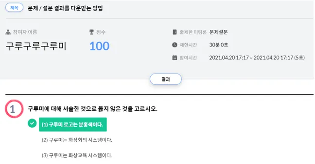 퀴즈 또는 설문조사가 완료되면 결과를 다운로드할 수 있습니다.