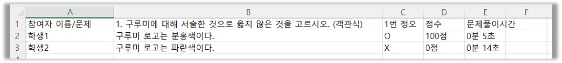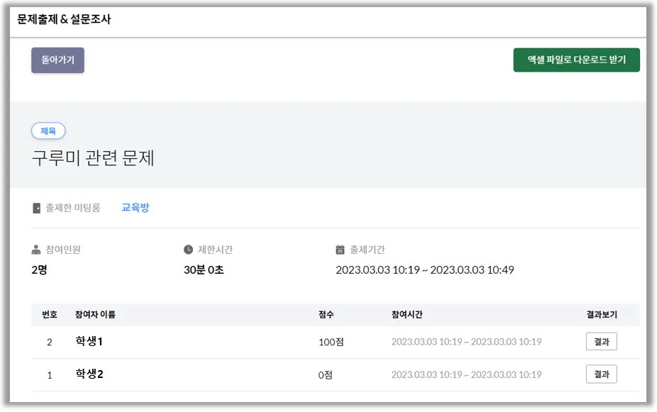 전체적인 참여자들의 점수를 확인할 수 있으며, 우측 상단의 엑셀 파일로 다운로드 받기 버튼을 클릭하면 엑셀 파일로 결과 확인도 가능합니다.