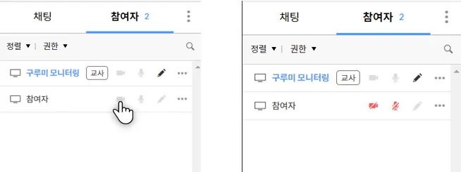 참여자 목록 이름 옆에 카메라와 마이크 버튼을 한번씩 클릭해