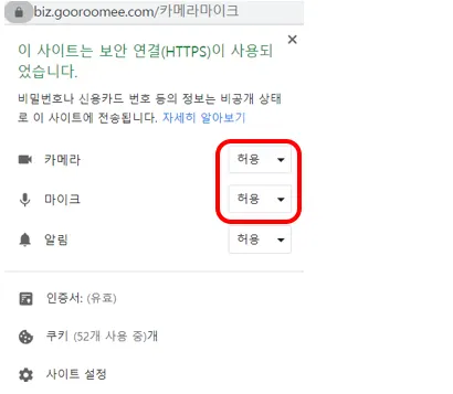 주소창 왼쪽의 자물쇠 버튼을 눌러 카메라와 마이크가 허용이 되어있는지 확인해주세요!