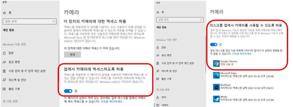 허용이 되어있다면, 윈도우 검색창에 '카메라 개인 정보 설정'이라고 검색하셔서 설정창을 켜신 후,