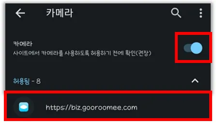 카메라와 마이크가 허용 상태인지 확인하고, 구루미 비즈 사이트에서 허용됨으로 되어있는지 확인합니다.