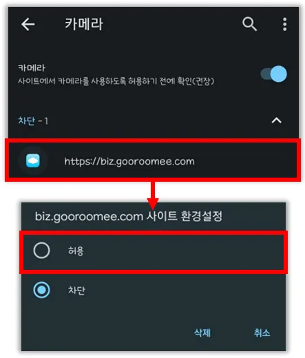 구루미 비즈 사이트에서 차단이 되어있다면 해당 사이트 주소를 눌러 허용으로 변경합니다.