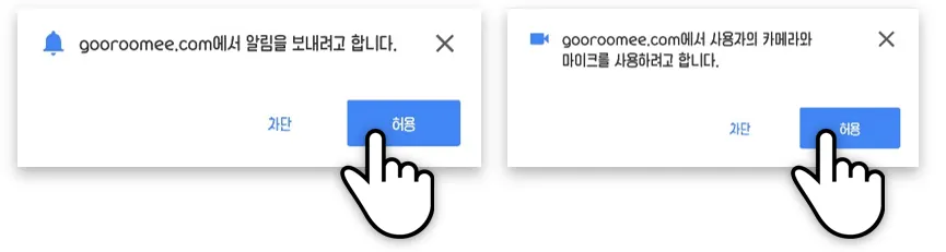 카메라와 마이크에 대한 사용 권한에 반드시 '허용'을 눌러주세요.