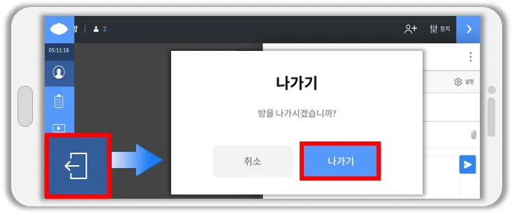 퇴장을 원하신다면 좌측 하단에 있는 퇴장 버튼 ( 문 모양 )을 눌러주세요.