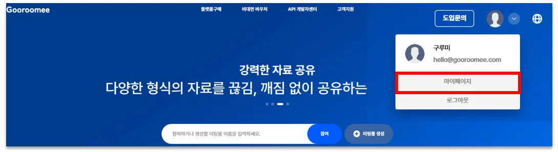 화면 우측 상단에 사람 모양 옆 화살표 표시 클릭하시면 마이페이지가 뜹니다.