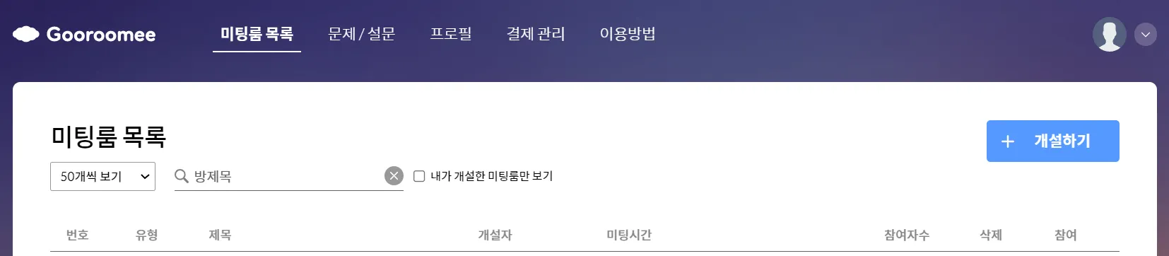 미팅룸 목록에서는 내가 개설한 미팅룸이 보이게 되며