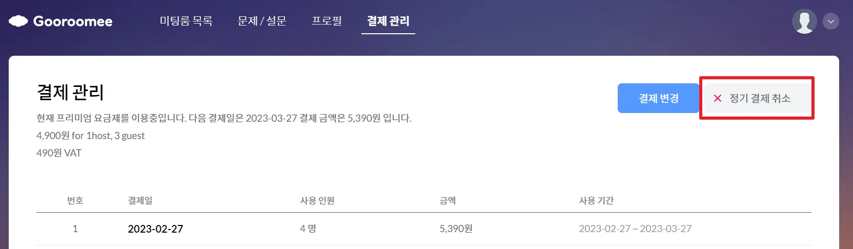 월별 자동 결제를 해지하고 싶으시다면 결제 관리에서 정기 결제 취소 버튼을 눌러 취소해 주시면 됩니다.