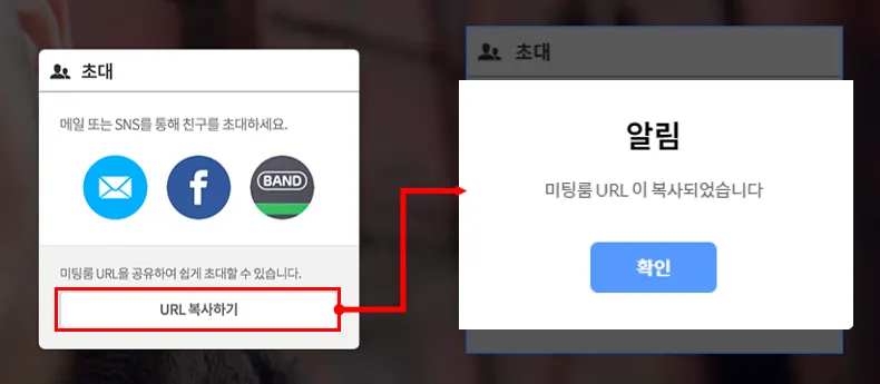 미팅룸 URL 주소 복사하기 기능으로 메신저 및 메일 등 간편하게 초대할 수 있습니다.