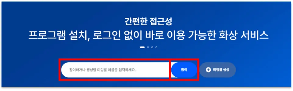 화면 중앙에 보이는 입력창에 참여할 미팅룸 이름을 입력한 뒤, 참여 버튼을 누릅니다.