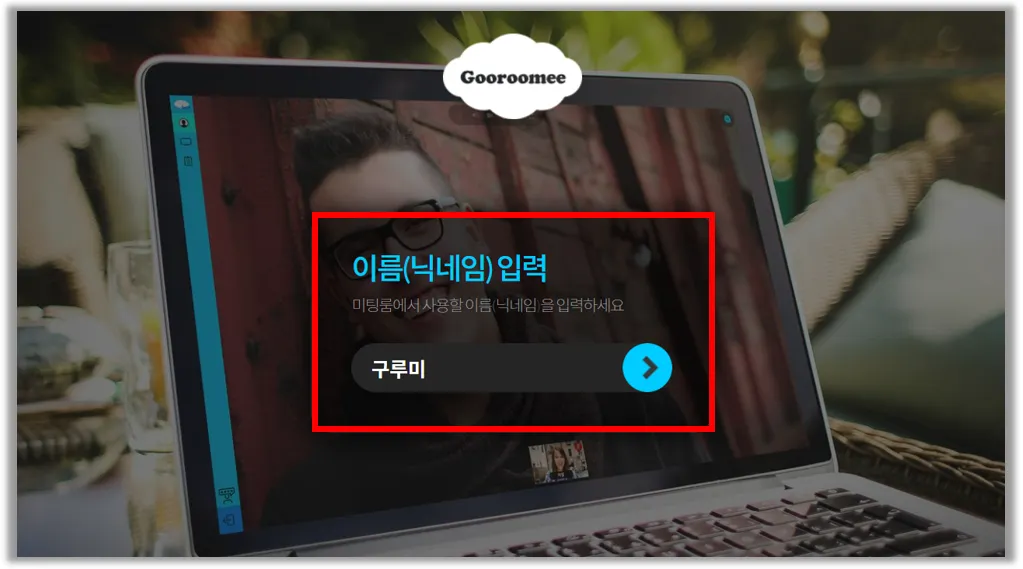 화면 중앙에 보이는 입력창에 '미팅룸에서 사용할 이름 ( 닉네임 )'을 입력합니다.