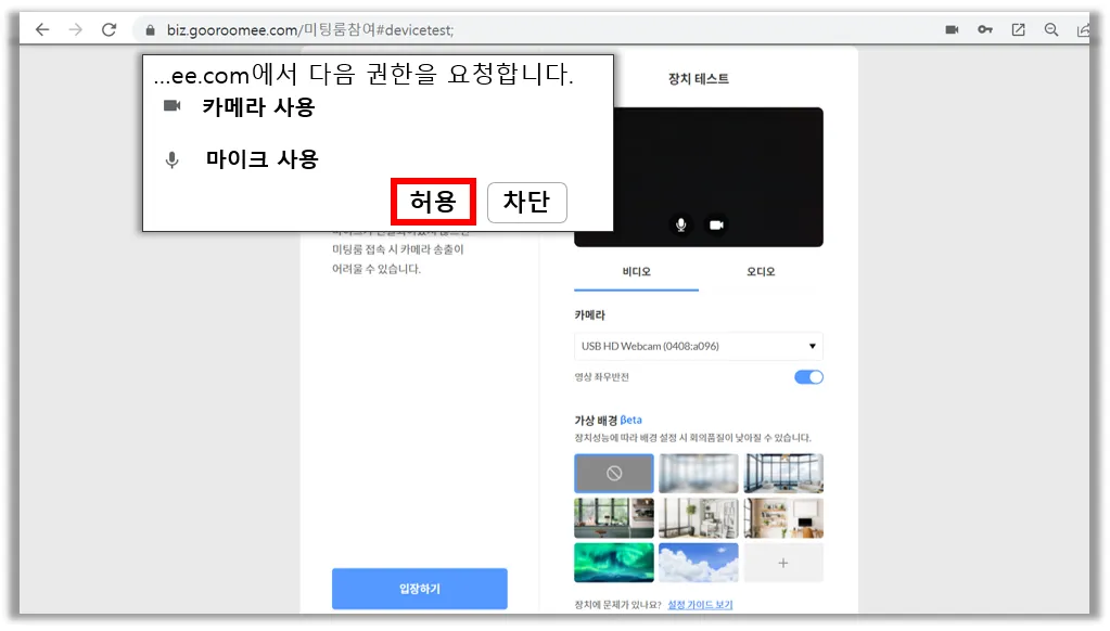 장치 테스트가 끝나면 입장하기 버튼을 눌러 입장해 주세요.