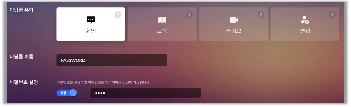 미팅룸을 개설하실 때, 프라이빗한 교육을 위해 비밀번호 설정을 할 수 있습니다.