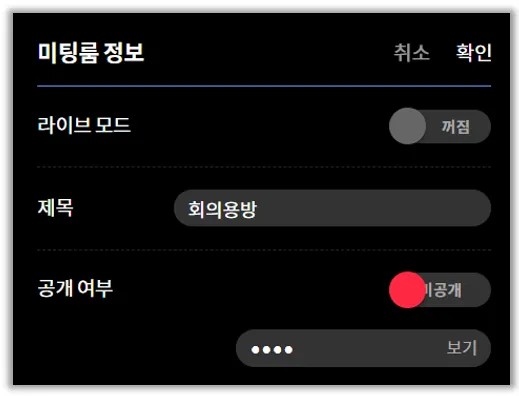 좌측 상단에 구름 클릭하면 나오는 미팅룸 정보 설정의 공개 여부에서