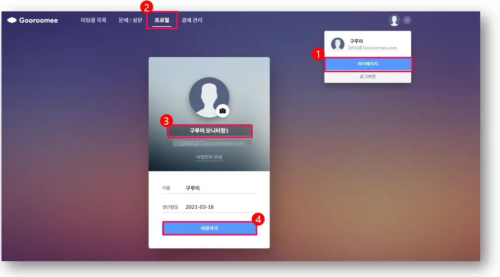 대화명 변경은 마이페이지의 프로필과 미팅룸 안에서 가능합니다.