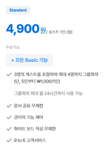 베이직 요금제는 3인 이상 입장 시 40분 시간제한이 있지만, 스탠다드 요금제는 시간제한 없이 이용이 가능합니다.