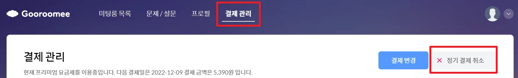 마이페이지 - 결제 관리 - 정기 결제 취소
