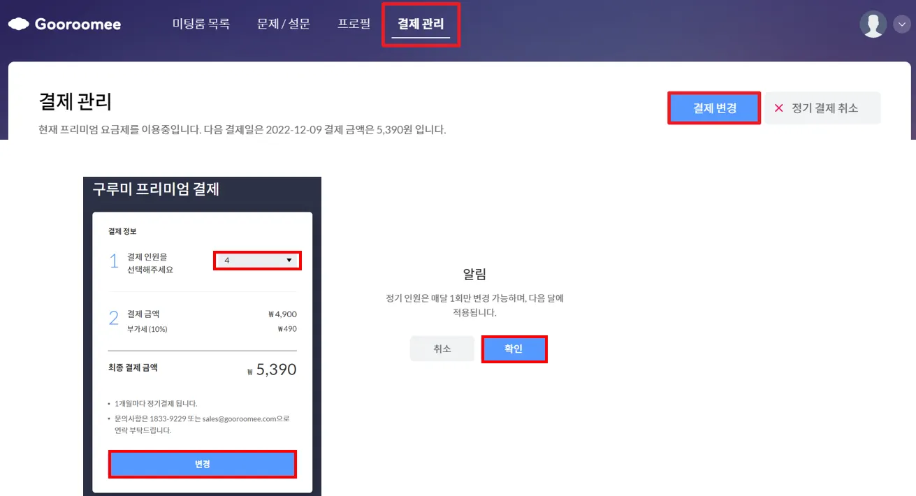 마이페이지 - 결제 관리 - 결제 변경 - 결제 인원 선택 - 변경